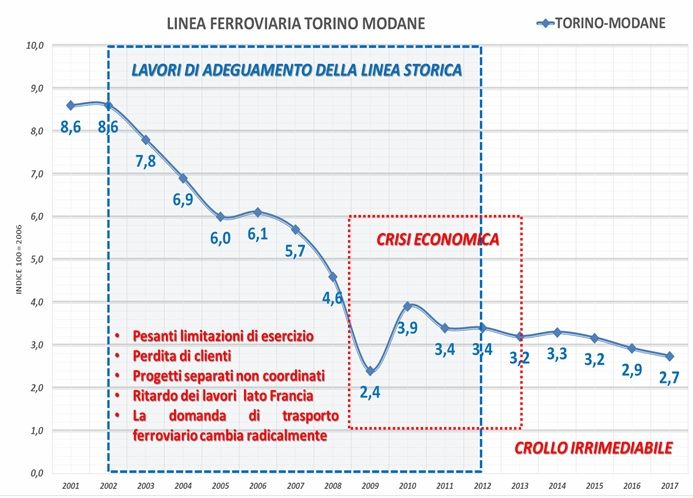 Il secondo dei grafici Tav forniti a Giornalettismo dall’ex senatore Stefano Esposito è quello proposto in tv da Dino Giarrusso ed è relativo solamente alla linea Torino-Modane, quella che passa per il traforo del Frejus. Lì i treni merci non passo quasi più a causa della linea vetusta e di altri problemi tecnici che impediscono ai treni merci di sfruttarla. Ed è proprio per questo che secondo Esposito occorre una nuova linea ad alta velocità.