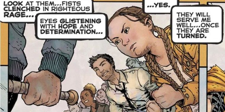 Ma come mai Frank Miller ha deciso di omaggiare Greta Thunberg proprio in quest’albo? Nel fumetto Darkseid e il Joker stanno facendo una campagna per rieleggere un governatore che assomiglia esattamente a Donald Trump. Anche se non è mai stato chiamato col nome del Presidente degli Stati Uniti il riferimento di Frank Miller è chiaro, così come la sua posizione contro le politiche del tycoon. Una folla di giovani si riunisce e circonda il sovrano di Apokolips, incluso un personaggio che assomiglia terribilmente a Greta Thunberg come potete vedere nell’immagine qui sotto.