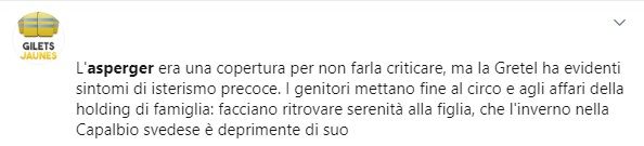 E se questo schifo non sembra sufficiente ecco nascere i complottisti che, adesso, mettono anche in dubbio le parole della stessa Greta Thunberg sulla sua sindrome di Asperger.