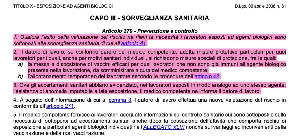 In particolare, la dichiarazione di Guariniello che sta facendo maggiormente discutere è questa: «Il discorso è un po’ articolato e riguarda il Testo Unico della Sicurezza sul Lavoro. L’art. 279 impone al datore di lavoro di mettere a disposizione ‘vaccini efficaci per quei lavoratori che non sono già immuni all’agente biologico, da somministrare a cura del medico competente’». Ed effettivamente il Testo Unico della Sicurezza del Lavoro nella sua ultima versione (D.lgs. 9 aprile 2008, n. 81 Testo coordinato con il D.Lgs. 3 agosto 2009, n. 106), disponibile anche sul sito ufficiale dell’Ispettorato, sottolinea proprio questo aspetto che sa di contraddizione.