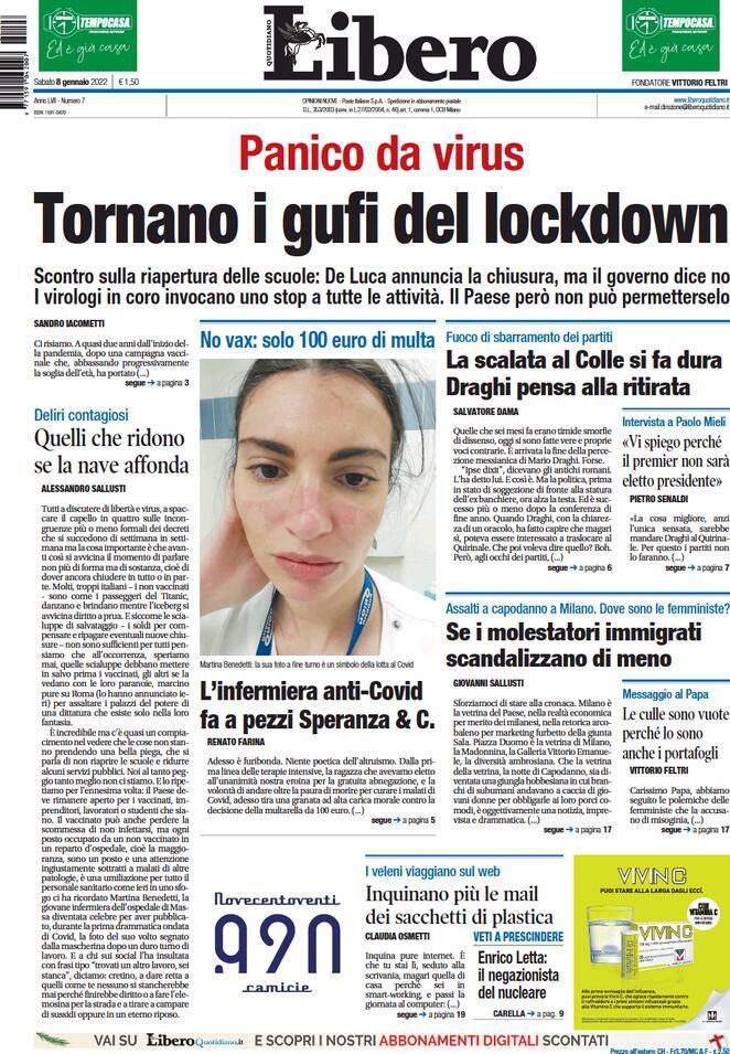 Nella prima pagina di Libero Quotidiano in edicola oggi (sabato 8 gennaio 2022), compare un titolo a nove colonne: «Tornano i gufi del lockdown». Il tutto è accompagnato da un articolo che inizia con: «Ci risiamo».