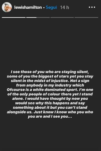 «Vedo quelli di voi che tacciono, alcuni di voi sono le stelle più luminose e ancora state zitti per le ingiustizie. Non un segno da parte della mia industria, che naturalmente è uno sport dominato dai bianchi – scrive Lewis Hamilton su Instagram -. Sono uno dei pochi di colore e pertanto sono da solo. Mi sarei aspettato diceste qualcosa, che vedeste perché certe cose succedono ma non siete in grado di sostenerci. Sappiate solo che io so chi siete e vi vedo…».
