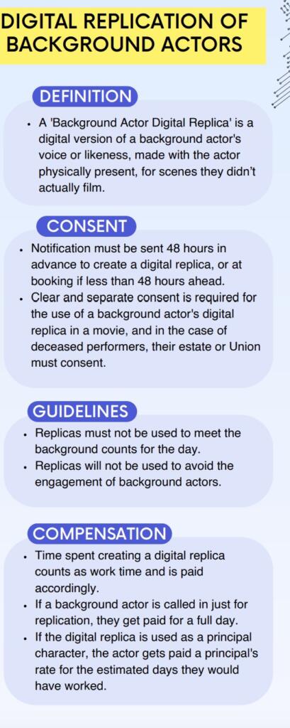 «È necessario ottenere un consenso chiaro e visibile per alterare digitalmente la performance dell’esecutore materiale precedentemente registrato, a meno che non rimanga sostanzialmente come da copione, esecuzione e/o registrazione. I produttori forniranno una descrizione ragionevolmente specifica delle modifiche previste. Se i movimenti labiali o facciali vengono alterati per far sembrare che un attore di sfondo stia parlando e viene aggiunto un dialogo, verrà aggiornato da un “day performer».