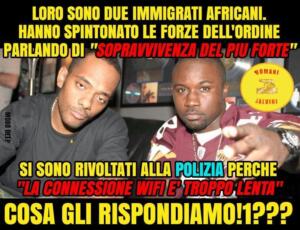 Loro sono due immigrati africani. Hanno spintonato le forze dell’ordine parlando di “Sopravvivenza del più forte”. Si sono rivoltati alla polizia perché “La connessione WiFi è troppo lenta”. Cosa gli rispondiamo!1???