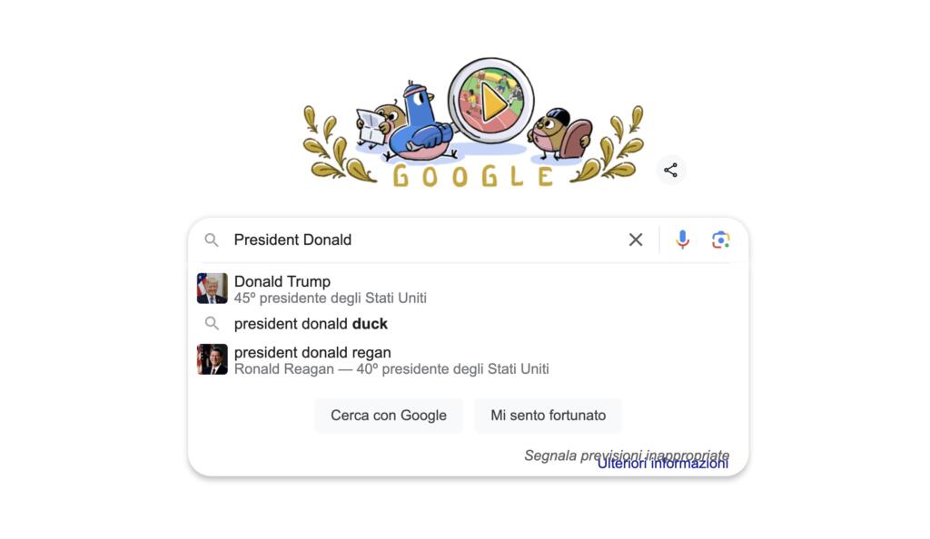 Piccola premessa. Abbiamo provato a effettuare la stessa ricerca pubblicata da Trump, ma dall’Italia i risultati sono ben diversi: cercando “President Donald”, il primo risultato è relativo a Donald Trump. Poi troviamo il tanto famigerato “President Donald Duck” e, infine, i suggerimenti si chiudono con Donald Reagan (con annesso errore “Regan” come suggerimento).