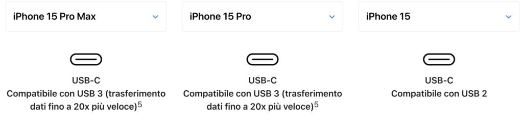 I modelli più performanti (e costosi) presentano un connettore compatibile con USB 3, la nuova generazione che consente il trasferimento di dati in modo molto più veloce. I modelli base, invece, hanno compatibilità solamente con USB 2 (quindi trasferimento dati più lento). In dotazione insieme a tutti questi iPhone c’è un cavo USB, ma non nella versione “3”.