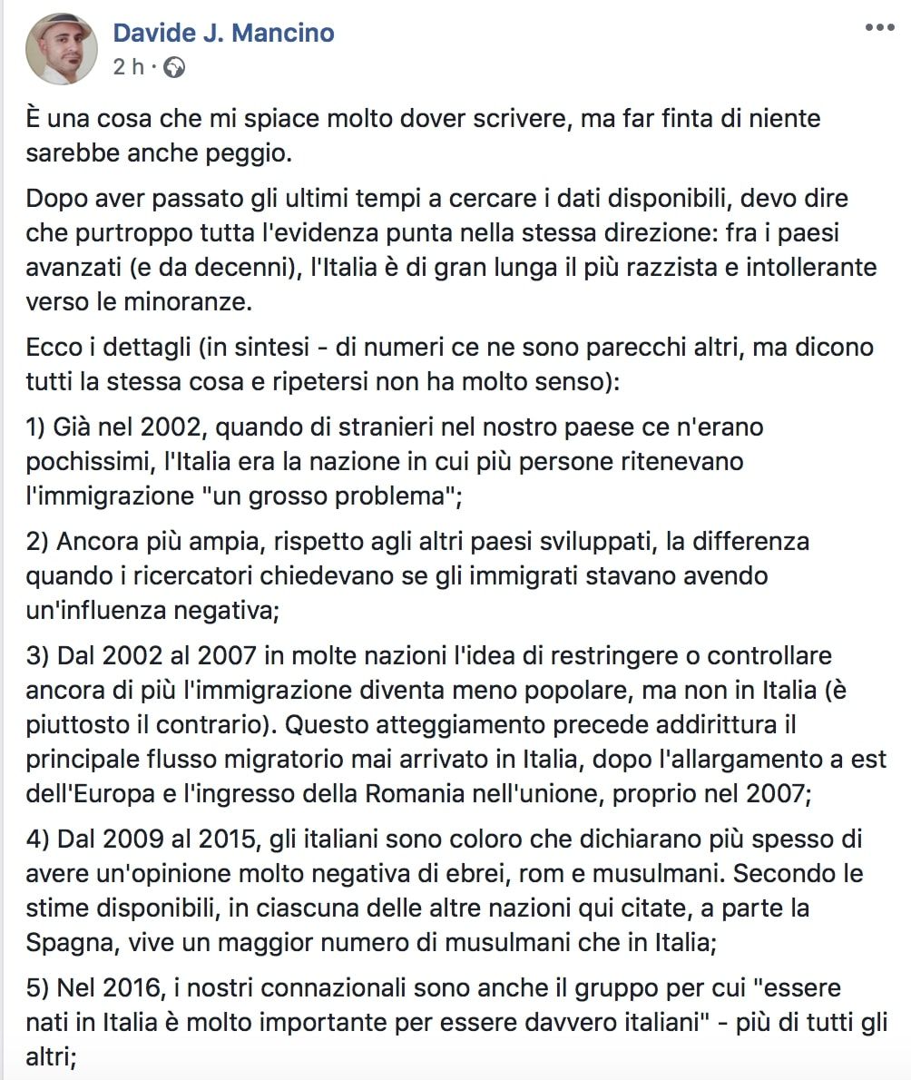 Entrambi i fronti, tuttavia, hanno una visione parziale di un problema che, in Italia, è presente almeno dal 2002. Il nostro Paese ha una forte tendenza razzista e intollerante – la peggiore tendenza d’Europa – da 16 anni a questa parte. La riflessione è partita, sulla base di alcune indicazioni fornite, in un post su Facebook, dal data journalist Davide Mancino che ha citato diversi sondaggi e ricerche del Pew Research Center, un think tank statunitense con sede a Washington che analizza problemi sociali, opinione pubblica, andamenti demografici.
