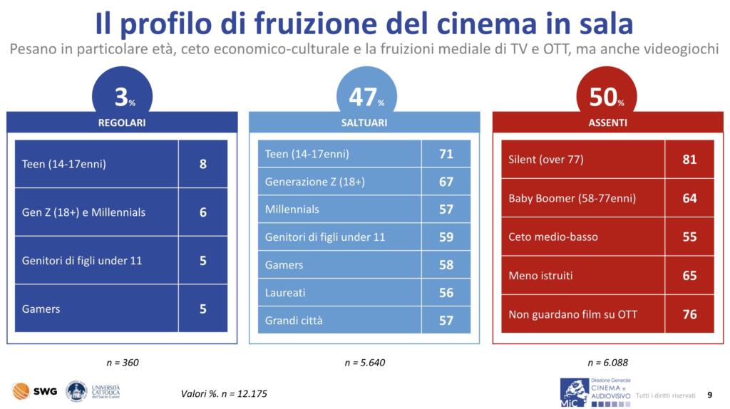 Dunque, i valori sono in aumento rispetto alla rilevazione – fatta sempre da SWG per il Mic – dell’anno precedente. Ma chi sono gli italiani che vanno al cinema? Il campione intervistato è variegato, ma è possibile effettuare una suddivisione per fasce d’età e altre caratteristiche.