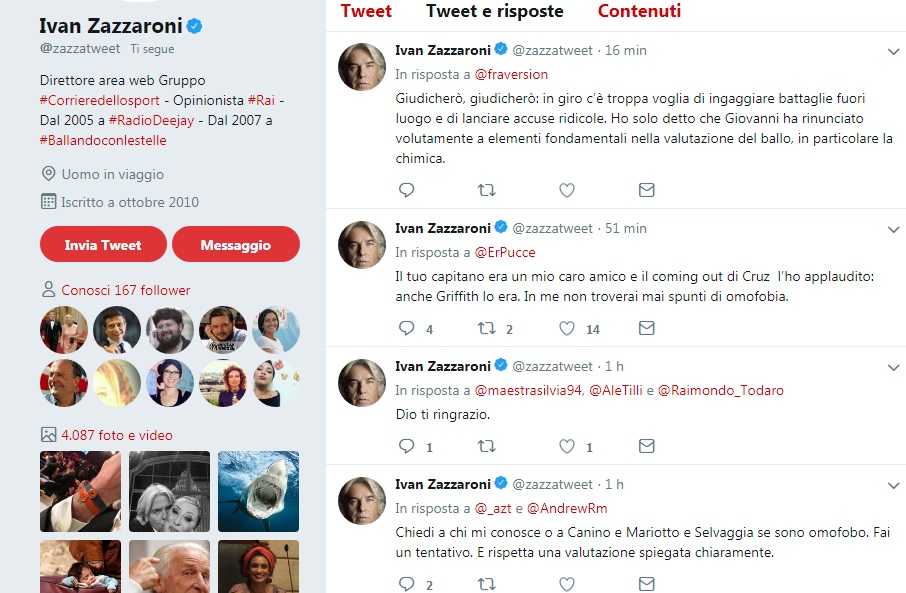 «Chiedi a chi mi conosce o a Canino e Mariotto e Selvaggia se sono omofobo. Fai un tentativo. E rispetta una valutazione spiegata chiaramente.Giudicherò, giudicherò: in giro c’è troppa voglia di ingaggiare battaglie fuori luogo e di lanciare accuse ridicole. Ho solo detto che Giovanni ha rinunciato volutamente a elementi fondamentali nella valutazione del ballo, in particolare la chimica», ha scritto Zazzaroni.