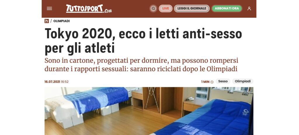Le evidenza, dunque, c’erano già tutte. Eppure questa storia dei letti anti-sesso Tokyo 2020 non si è limitata alla bufala social. A condividere articoli su questo tema (sbagliando) sono state anche testate sportive. Questo, per esempio, è Tuttosport in un articolo pubblicato il 16 luglio 2021.