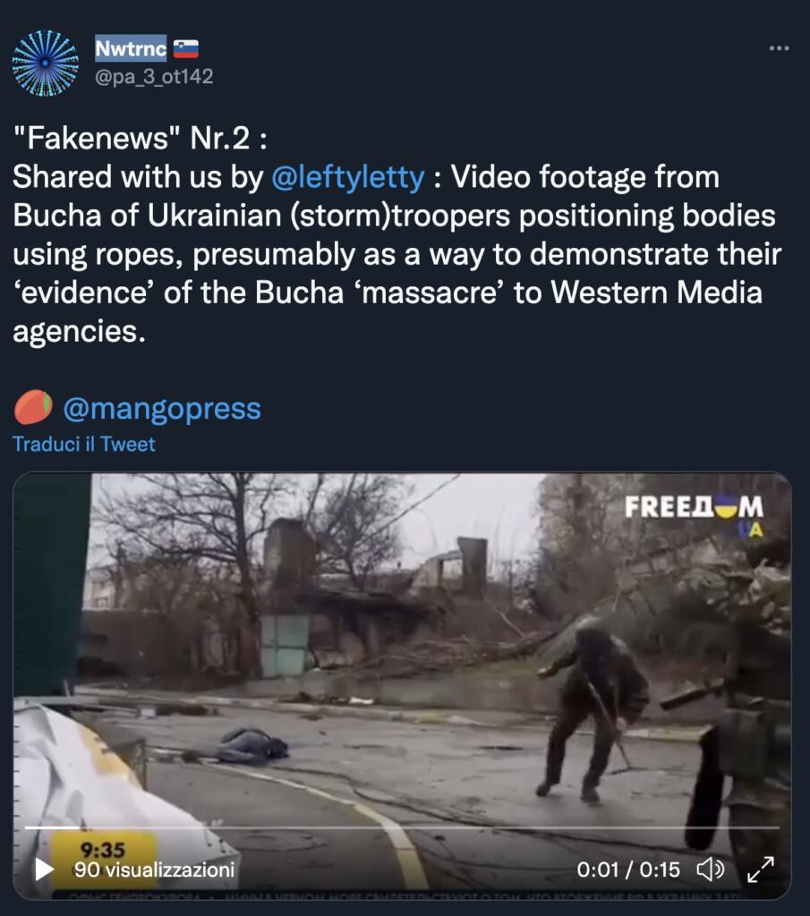 Tweet in cui appaiono spezzoni di filmati e cancellati di ogni riferimento e spiegazione se non quella cospirazionista. Sedicenti giornalisti che si appoggiano a galassie di portali-blog a loro nome per diffondere e dare ampia portata alla condivisione di fake news. È all’interno di questo ecosistema che ha preso vita l’ennesima bufala attorno all’uccisione di civili ucraini a Bucha, con un video decontestualizzato che – secondo la propaganda filo-russa che vive e lotta sui social – mostrerebbe (ma lo diciamo subito: non dimostra assolutamente quella tesi) i militari ucraini intenti a trascinare corpi senza vita da mettere “sulla scena” per accusare la Russia.