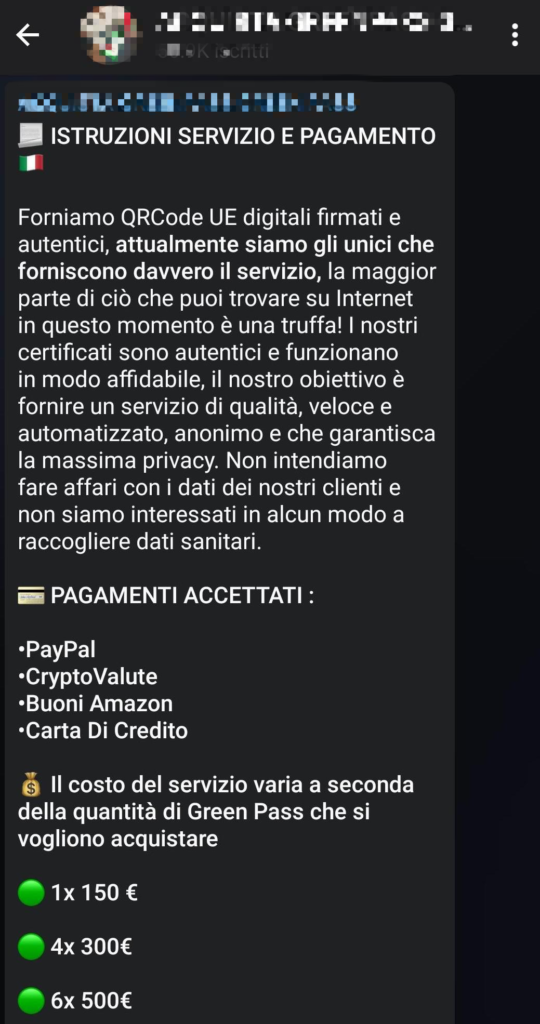 «Forniamo QRCode UE digitali firmati e autentici – si legge nel messaggio fissato in alto nella chat (e negli altri canali del gruppo) -, attualmente siamo gli unici che forniscono davvero il servizio, la maggior parte di ciò che puoi trovare su Internet in questo momento è una truffa! I nostri certificati sono autentici e funzionano in modo affidabile, il nostro obiettivo è fornire un servizio di qualità, veloce e automatizzato, anonimo e che garantisca la massima privacy. Non intendiamo fare affari con i dati dei nostri clienti e non siamo interessati in alcun modo a raccogliere dati sanitari».