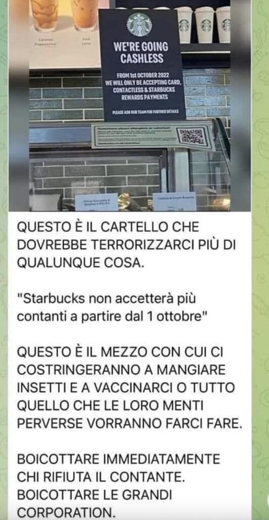 Il cartello immortalato, in effetti, sembra confermare proprio questa narrazione: «Dal 1° ottobre 2022 accetteremo esclusivamente pagamenti con carta, contactless o rewards (la campagna di “premi” per i clienti fidelizzati, ndr)». E allora, perché parliamo di bufale e disinformazione?