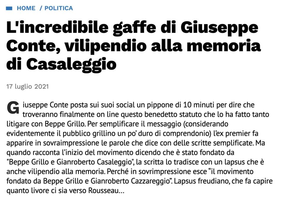 Prendere per buone le ricostruzioni fatte sui social network e realizzarci un articolo di giornale senza verificare, spingendosi in giudizi offensivi nei confronti di molti. Questa grande opera pia è stata effettuata dal quotidiano Il Tempo che sabato sera ha dato il via libera a una polemica su una presunta gaffe di Giuseppe Conte nel suo video-messaggio pubblicato sui social. L’attenzione si è spostata su un passaggio (attorno al minuto 1′ e 46”) in cui l’ex Presidente del Consiglio avrebbe pronunciato in modo sbagliato (con effetto comico) il nome del fondatore del MoVimento 5 Stelle: Gianroberto Casaleggio sarebbe diventato “Cazzareggio“. I video che circolano sui social vanno nella direzione dell’errore, ma spieghiamo perché non è così. E per farlo basta ascoltare il video.