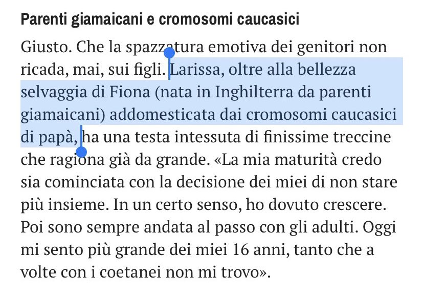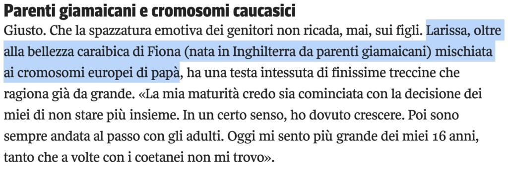 L’articolo in questione è un’intervista realizzata da Gaia Piccardi a Larissa Iapichino. Già due anni fa, la giovane era in rampa di lancio e i suoi risultati sportivi non potevano che farla paragonare a sua madre: Fiona May, bandiera dell’atletica italiana. E, il 9 agosto 2018, la giovanissima atleta veniva descritta così. «Larissa, oltre alla bellezza selvaggia di Fiona (nata in Inghilterra da parenti giamaicani), addomesticata dai cromosomi caucasici, ha una testa intessuta di finissime treccine che ragiona già da grande».