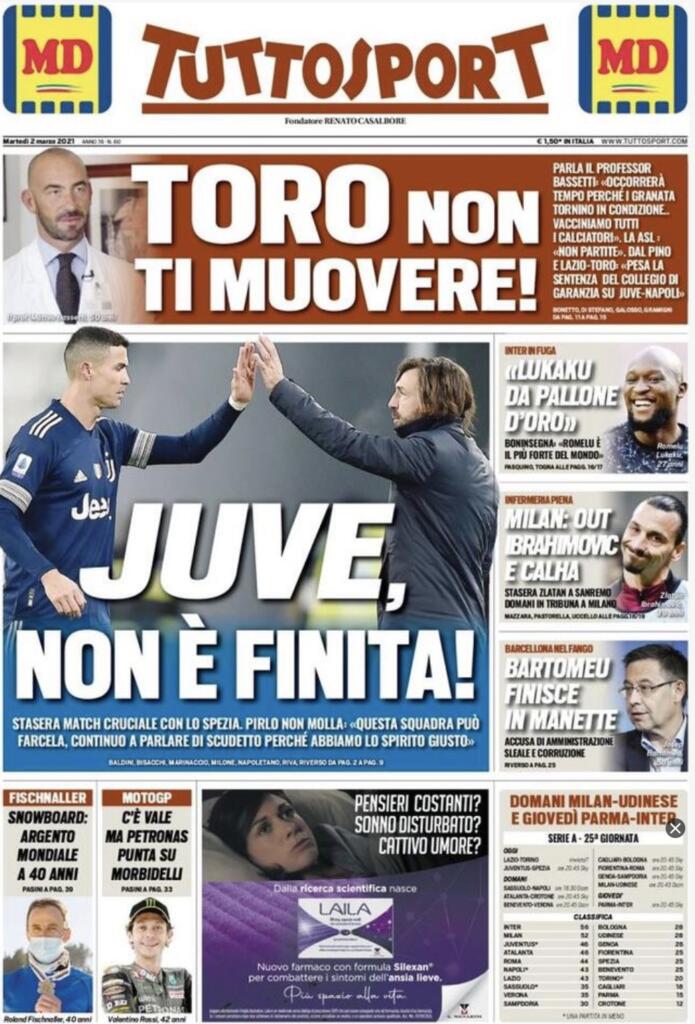 E per scoprire di cosa parliamo, basta andare a prendere due tagli alti di due prime pagine di Tuttosport. Partiamo dall’edizione in edicola oggi, martedì 2 marzo 2021.
