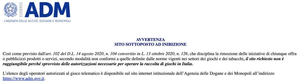 Come detto, entrambi gli indirizzi presenti all’interno delle carte della Procura di Torino non sono più raggiungibili, ma non per l’intervento dell’Agenzia delle Dogane e dei Monopoli. Quando, infatti, scende in campo l’ADM, quando si tenta di accedere a un url inibito sul suolo italiano si viene rimandati a una landing page che riporta questo avviso