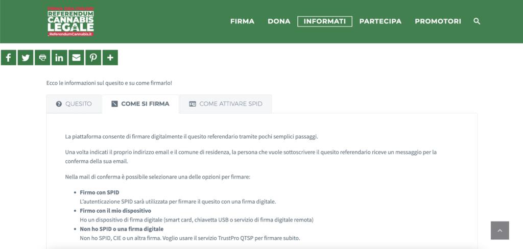 Poi si potrà procedere, secondo diverse modalità (basate sul metodo di autenticazione scelto), alla firma digitale per partecipare a questa raccolta che potrebbe dare il via al Referendum sulla depenalizzazione della cannabis legale.