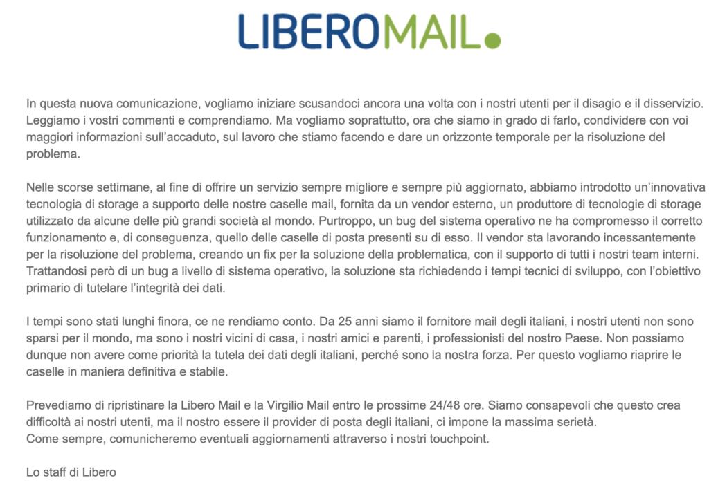 Il caso che ci riguarda più da vicino è quello che ha visti coinvolti i due provider di posta elettronica gestiti da ItaliaOnline. Nella notte tra domenica e lunedì, infatti, qualcosa è andato storto. E ancora nella mattinata di giovedì (mentre il sistema stava lentamente riprendendo le proprie funzioni), sui siti ufficiali di Libero e Virgilio compare la versione finale del comunicato.