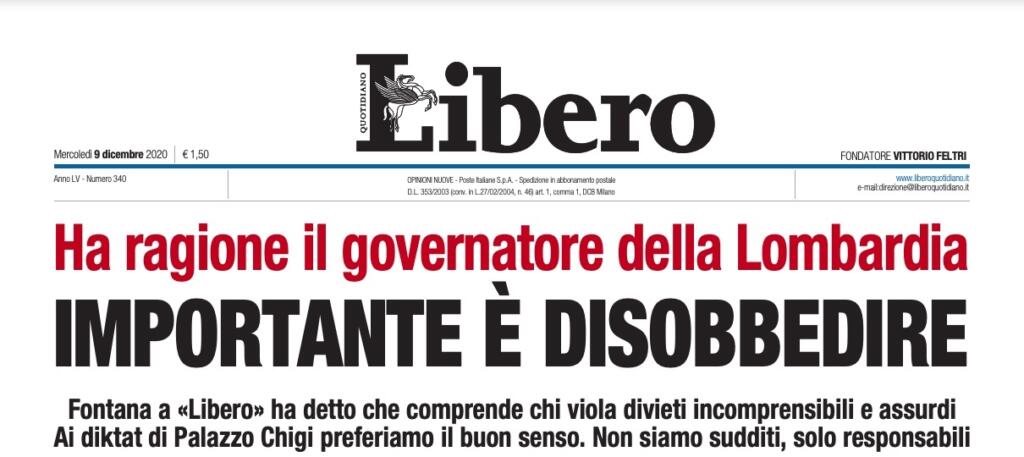 «Ha ragione il governatore della Lombardia: importante è disobbedire». Poi, nel sommario, si sciorinano le varie dichiarazioni rilasciate da Attilio Fontana a Libero: un atto di comprensione nei confronti di chi vìola i divieti, definiti incomprensibili e assurdi. E c’è un richiamo al buon senso degli italiani. Secondo lui – e Libero – basterebbero degli avvisi ai cittadini e non le leggi.