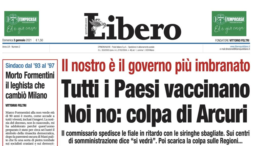 Dopo una lunga battaglia, i numeri sono in chiaro e disponibili a tutti. Nonostante questo, la ricerca del titolo scandalistico non abbandona le modalità comunicative di Libero Quotidiano che oggi titola così: «Tutti i Paesi vaccinano. Noi no». I bersagli sono, ovviamente, il governo e il commissario Domenico Arcuri. Ma i dati mondiali smentiscono questa tesi portata avanti dal quotidiano fondato da Vittorio Feltri e diretto da Pietro Senaldi. Addirittura l’Italia è al secondo posto tra i Paesi dell’Unione Europea (quindi Regno Unito escluso) per vaccini effettuati. Certo, a una settimana dal via della campagna vaccinale ci si attendeva qualcosa in più, ma dire che in Italia non si stiano facendo vaccini è una trovata per solleticare i fini palati di chi contesta a prescindere. Insomma, Libero sui vaccini non dà l’esatta misura della situazione.