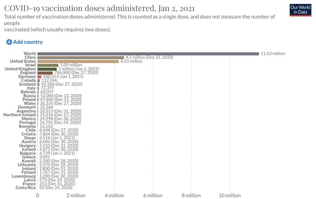 I numeri sono stati raccolti e sono pubblici. Già sappiamo del portale italiano che aggiorna – quasi in tempo reale – le dosi utilizzate. Poi c’è il resto del mondo che si mostra in questo grafico generato dai dati ufficiali (non ufficiosi) diffusi dai singoli Stati e sintetizzati da Ourworldindata.org.