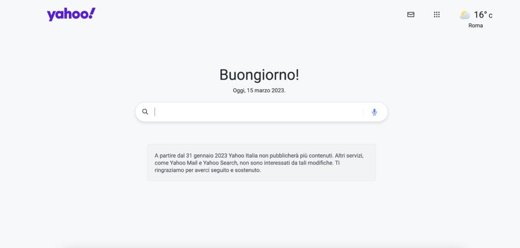 «A partire dal 31 gennaio 2023 Yahoo Italia non pubblicherà più contenuti. Altri servizi, come Yahoo Mail e Yahoo Search, non sono interessati da tali modifiche. Ti ringraziamo per averci seguito e sostenuto».