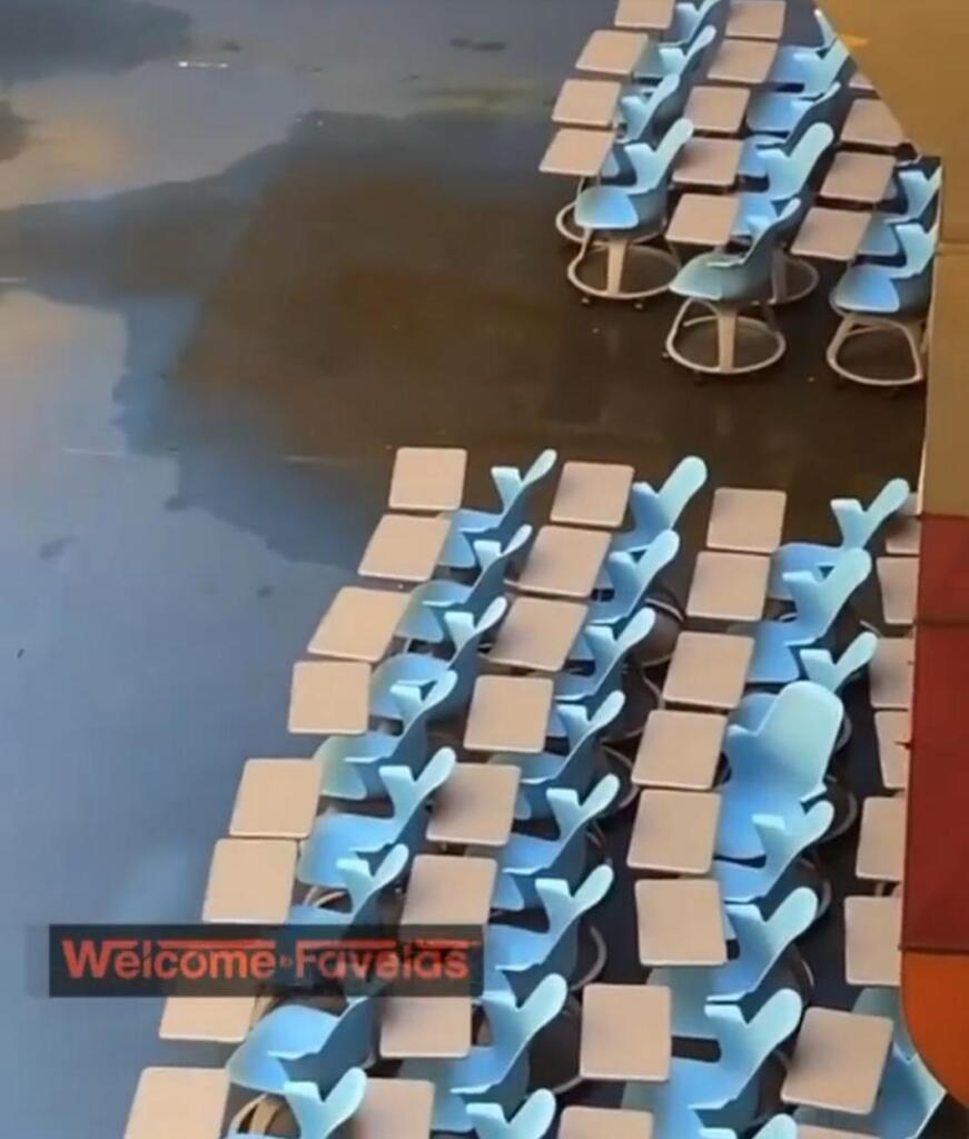 I nuovi banchi a rotelle lasciati sotto la pioggia che si è abbattuta (e si sta abbattendo ancora oggi) sulla capitale. Quelle sedute, probabilmente, sostituiranno ben presto i vecchi banchi presenti nelle varie classi. Operazione impossibile da fare durante le lezioni quotidiane. Quindi si procederà con la distribuzione nella aule quando gli studenti torneranno a casa. Ma resta comunque il peso di questa immagine.