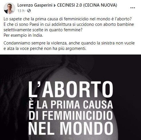 «Lo sapete che la prima causa di femminicidio nel mondo è l’aborto?». Esordisce così il post pubblicato da Lorenzo Gasperini sul suo profilo Facebook e in alcuni gruppi social utilizzati come forum di confronto dai cittadini che vivono nel comune di Cecina (dove lui ricopre il ruolo di consigliere comunale della Lega), in provincia di Livorno. Il suo messaggio prosegue: «E che ci sono Paesi in cui addirittura si uccidono con aborto bambine selettivamente scelte in quanto femmine? Per esempio in India. Condanniamo sempre la violenza, anche quando la sinistra non vuole e alza la voce perché non ha più argomenti».