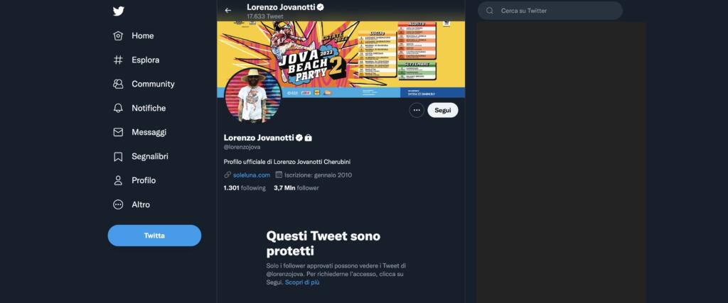 Da questa mattina, mercoledì 10 agosto, provando a collegarsi sul profilo Twitter – @lorenzojova – del cantautore (se già non si è follower o non si è mai stati “taggati” da quell’account), gli utenti si sono trovati di fronte a questa situazione.