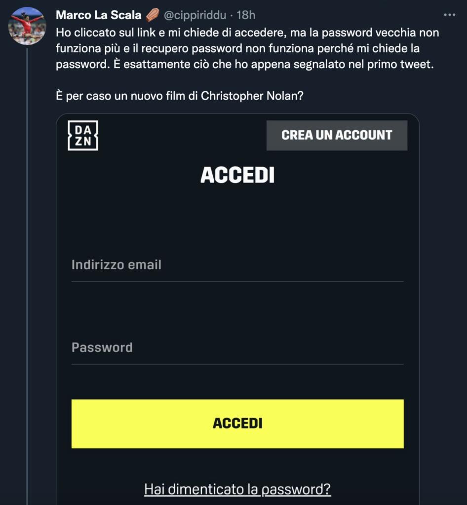 Tra le segnalazioni – a cui la stessa Dazn ha provato a rispondere su Twitter – da un utente che via social ha pubblicato gli screenshot di quanto ricevuto via mail e anche l’immagine del tentativo – vano – di ripristinare la propria password.