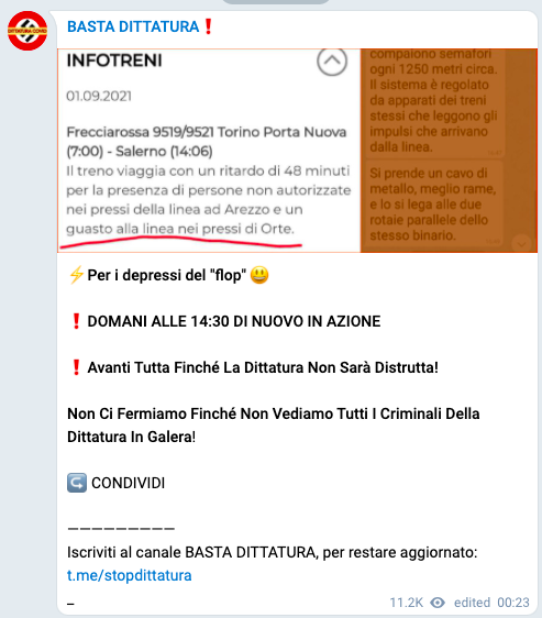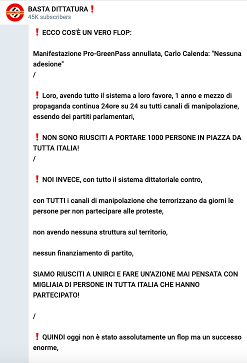 Se ci si fa un giretto nella chat “Basta dittatura!” – che è stata particolarmente attiva nell’organizzazione della manifestazione di ieri – si leggono messaggi che fanno avvertire un vero e proprio senso di distacco dalla realtà. Le poche persone che si sono recate nelle stazioni (due persone a Napoli, l’ormai celebre signora nel piazzale della stazione Tiburtina, qualche sparuto gruppetto a Milano) sono diventate «migliaia di persone in tutta Italia che hanno partecipato» e persino i normali disagi alla circolazione dei treni (circostanza non rara in Italia) sono stati salutati come un successo dei manifestanti. Il gruppo è pubblico ed è accessibile: facile recuperare qualche screenshot: