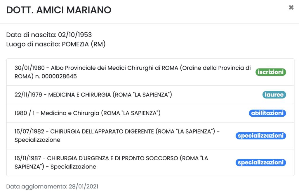 Finisce qui. Perché di medicina non si parla più. Si cita il suo passato da politico, anche da sindaco di Ardea dal 1981 al 1944, della sua famiglia e di sua moglie. Poi il focus sui figli: il maschio talento dei kart, la femmina imprenditrice del vino. E la medicina? E la sua carriera? Detto che il suo curriculum vitae (che ha sventolato, metaforicamente, sia domenica contro Matteo Bassetti sia giovedì contro il viceministro Sileri) in rete non si trova, abbiamo cercato qualcosa sul sito della Federazione Nazionale degli Ordini dei Medici Chirurghi e degli Odontoiatri. Nella sezione Ricerca Professionisti, ecco comparire il suo nome.