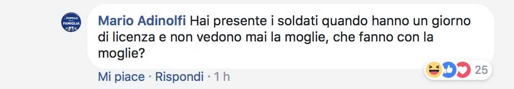 Da evidenziare, tra i tanti, anche il commento di un utente che gli chiede quando avesse trovato il tempo per fare un bambino, dal momento che è sempre in giro tra convegni e incontri per la campagna elettorale. La risposta di Adinolfi è stata cameratesca: «Hai presente i soldati quando hanno un giorno di licenza e non vedono mai la moglie, che fanno con la moglie?».