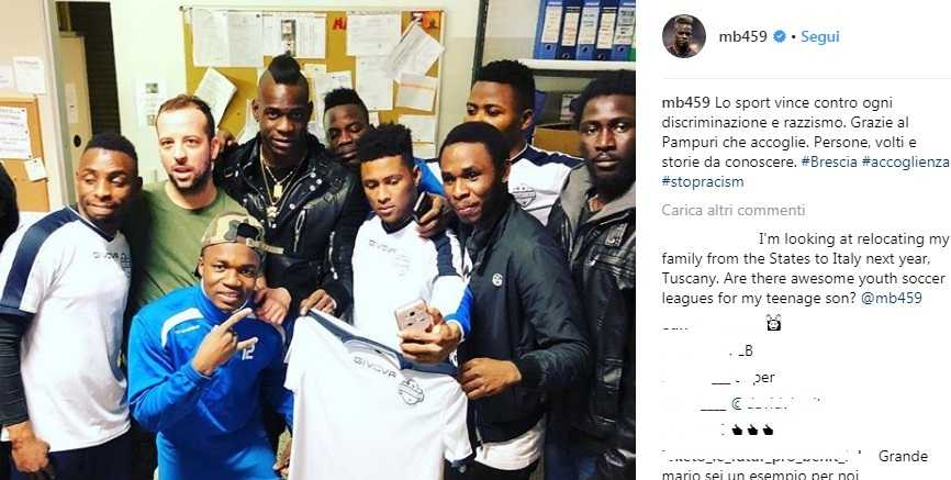 Mario Balotelli ha pubblicato sul suo profilo Instagram una foto della cena coi richiedenti asilo, corredata da un messaggio antirazzista. «Lo sport vince contro ogni discriminazione e razzismo. Grazie al Pampuri che accoglie. Persone, volti e storie da conoscere. #Brescia #accoglienza #stopracism», ha scritto Mario Balotelli.