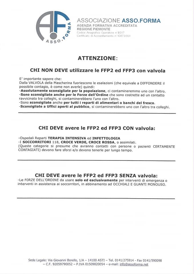 In particolare l’attenzione si sposta sulla seconda pagina del vademecum redatto da Asso.forma (presente ancora sul loro sito ufficiale), nel quale viene spiegato chi deve e chi non deve assolutamente indossare le mascherine con valvola (quelle comunemente indicate con le sigle ffp2 e ffp3).