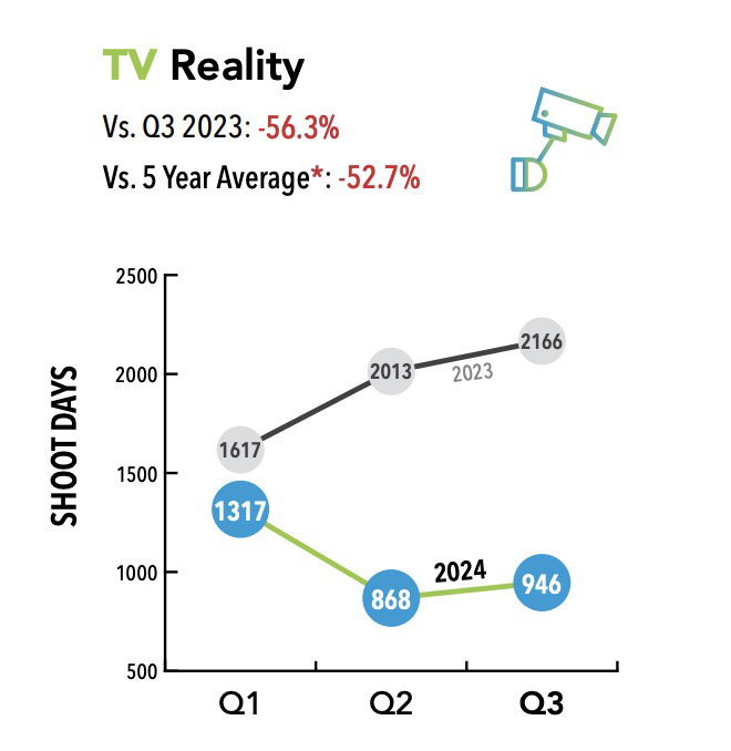 Secondo un recente report pubblicato dall’ufficio che si occupa dell’assegnazione dei permessi per la produzione (in termini di “girato”) cinematografica e televisiva nella contea di Los Angeles – il FilmLA -, rispetto al terzo trimestre (luglio-agosto-settembre) del 2023, la produzione di reality show dentro e nei dintorni di Hollywood è calata del 56,3%, confermando un trend che si è avviato da qualche stagione a questa parte.