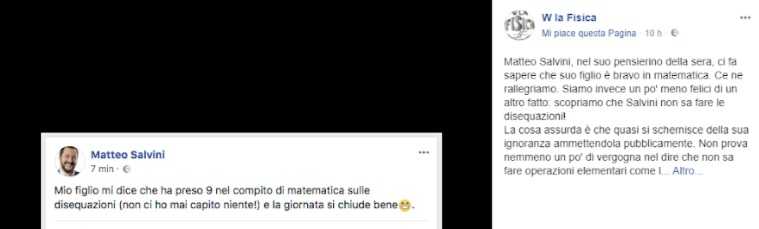 «Scopriamo che Salvini non sa fare le disequazioni! La cosa assurda è che quasi si schernisce della sua ignoranza ammettendola pubblicamente. Non prova nemmeno un po’ di vergogna nel dire che non sa fare operazioni elementari come le disequazioni. In sottofondo sembra di sentire quel diffuso sentimento di orgoglio (mascherato da ammissione di ignoranza) di non capire nulla di matematica. Secondo voi avrebbe scritto “non ho mai capito niente di storia, geografia o italiano”? No, perché gli avrebbero dato tutti in coro dell’ignorante. Con la matematica sì invece, puoi tranquillamente dire che non capisci niente di matematica senza alcuna vergogna. L’ignoranza matematica è accettata socialmente, anzi fa quasi “fico”», scrive W la Fisica! in modo ampiamente condivisibile.