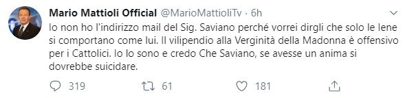 Poche ore dopo, e qualche istante prima della cancellazione del tweet e del profilo, Mattioli aveva detto di assumersi tutte le responsabilità di quello che aveva detto e scritto nei confronti di Roberto Saviano, rivendicando la propria libertà di espressione seppur, ha confessato, con toni molti accesi e sopra le righe. Poi, però, dopo gli insulti che stava ricevendo, ha preferito cancellarsi dai social. Oppure ne è stato sospeso, anche se sembra più verosimile la prima versione.