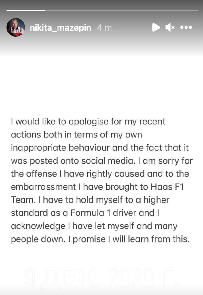 Mentre si attende una decisione da parte della scuderia britannica, Nikita Mazepin prova a chiedere scusa. Sempre attraverso una Instagram Stories.
