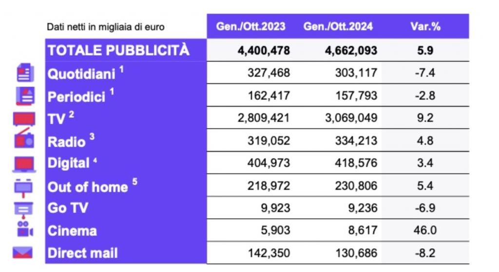 Una rivoluzione che è destinata a far crescere, ancora di più, il valore del mercato pubblicitario televisivo del prossimo anno. Stando ai dati più recenti diffusi da Nielsen, a ottobre 2024 questo settore (limitatamente al mezzo tv) è cresciuto del 5,9%. Un dato che, preso su lungo periodo gennaio-ottobre 2024, mostra un indice di aumento pari al 9,2% (rispetto allo stesso periodo del 2023).
