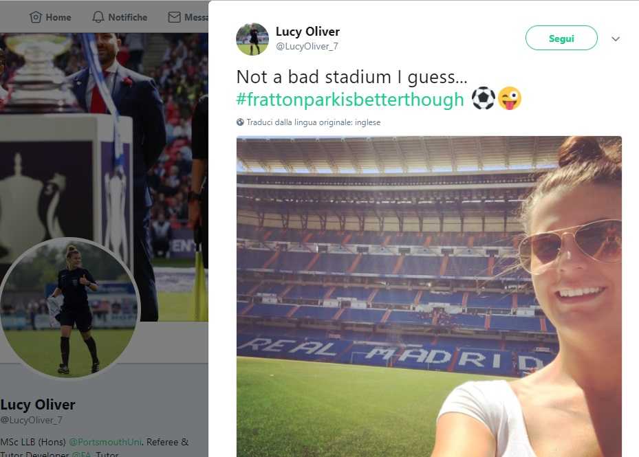 Nelle due immagini pubblicate su Twitter, e diffuse dai tifosi juventini più complottisti, Lucy Oliver scrive di amare Madrid, e apprezza il Santiago Bernabeu. Queste foto sono state interpretate come una sorta di rivelazione sul tifo di Michael Oliver in favore del Real Madrid, ma una simile ipotesi davvero esagera in complottismo.