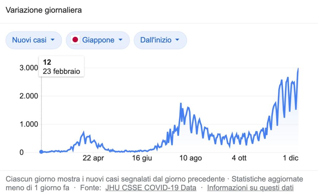 Adesso, però, anche in Giappone la curva è tornata a crescere, superando il picco raggiunto nel mese di aprile. Questo il grafico che indica la nuova corsa della pandemia Covid nel Paese nipponico.
