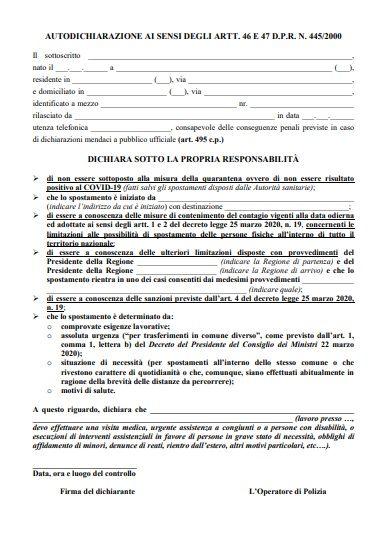 Ecco il ‘nuovo modulo’ per l’autocertificazione