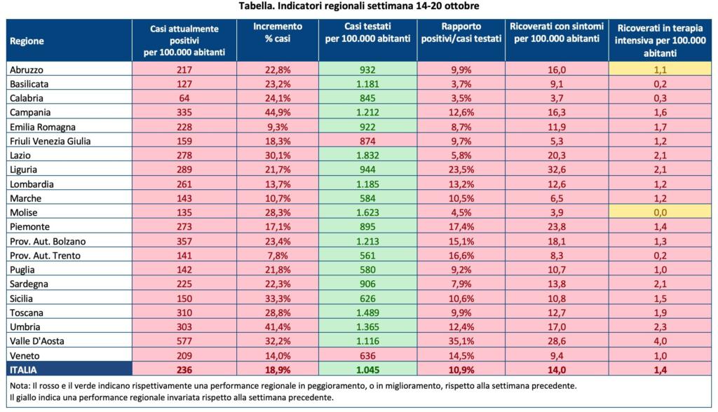 «Il dato più allarmante – sottolinea Nino Cartabellotta, presidente delle Fondazione Gimbe – è la brusca impennata del rapporto positivi/casi testati dal 7% al 10,9%, che certifica il fallimento del sistema di testing & tracing per arginare la diffusione dei contagi». Dati che sono evidenziati dalla sintesi contenuta in questa tabella.