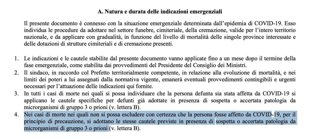 Nei casi di morte nei quali non si possa escludere con certezza che la persona fosse affetto da COVID-19, per il principio di precauzione, si adottano le stesse cautele previste in presenza di sospetta o accertata patologia da microrganismi di gruppo 3 o prioni.