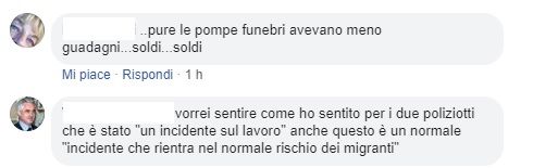 Il resto dei commenti sui social (oltre ad alcuni che sono veramente rammaricati per l’ennesima tragedia del mare) è un misto tra povertà intellettuale e voglia di fare sensazionalismo. C’è chi allude che con i porti aperti anche le pompe funebri avranno più lavoro, chi paragona le vittime del naufragio Lampedusa al dominicano che ha ucciso i due poliziotti a Trieste e chi ironizza sull’assenza di Carola Rackete nei salvataggi (da un profilo che ha il volto di un gatto e un cognome omonimo di un ex presidente del Consiglio italiano degli ultimi 30 anni).