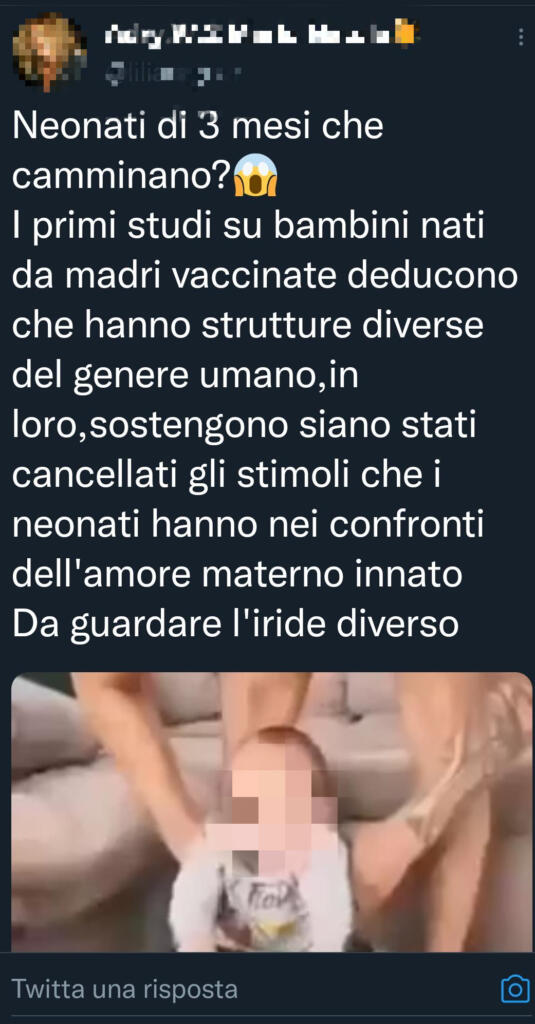 «Neonati di 3 mesi che camminano? I primi studi sui bambini nati da madri vaccinate deducono che hanno strutture diverse del genere umano, in loro, sostengono siano stati cancellati gli stimoli che i neonati hanno nei confronti dell’amore materno innato. Da guardare l’iride diverso». Insomma, piccoli bambini che vengono descritti come alieni.