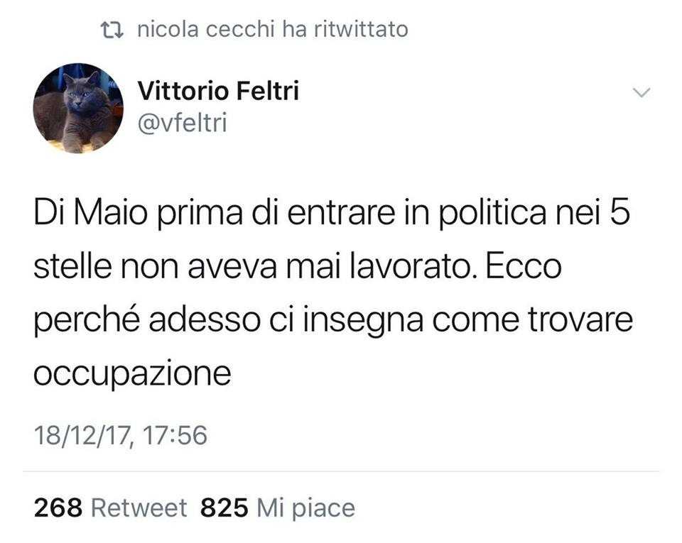 Solo poche settimane fa, il 18 dicembre del 2017, il candidato del M5S aveva retwittato un tweet di Vittorio Feltri che irrideva Di Maio per non aver mai lavorato:«Di Maio prima di entrare in politica nei 5 Stelle non aveva mai lavorato. Ecco perché adesso ci insegna come trovare occupazione». Un retweet che appare surreale se si considera che poco più di un mese dopo Nicola Cecchi è stato candidato col M5S in una sfida politicamente così rilevante come quella a Matteo Renzi. Il candidato dei 5 Stelle si è accorto di come i suoi tweet, anche del recente passato, fossero problematici, tanto da cancellare il suo profilo Twitter. Su Facebook ha invece spiegato in un lungo post il suo attovismo per il Sì al referendum costituzionale. «Se li conosci, li eviti… Una spiegazione necessaria per chi in queste ore si interroga sulla mia candidatura con il MoVimento 5 Stelle dopo il mio passato di vicinanza al PD: sono stato iscritto al Partito Democratico e dopo aver visto ciò che è diventato con Matteo Renzi ne sono uscito deluso e amareggiato, come molti altri iscritti ed elettori di centrosinistra. Se conosci il PD di Renzi, l’unica cosa che puoi fare è evitarlo, chiuderti la porta alle spalle e andare via. E’ dura ammettere “mi sono sbagliato” e riconoscere di aver messo il proprio impegno e la propria passione al servizio della causa sbagliata, ma è quello che ho dovuto fare io. Il passo successivo, e naturale, è stato mettermi al servizio del Paese con una forza coerente e trasparente come il MoVimento 5 Stelle. Anche a chi mi ricorda la mia campagna (qualche post) per il SI’ al referendum costituzionale rispondo senza imbarazzo: l’ho sostenuta nella convinzione che in quel momento fosse la migliore delle scelte possibili, convinto che la nostra Costituzione doveva e poteva essere migliorata. Ma col senno di poi, dopo la delusione per un Presidente del Consiglio che dice di dimettersi in caso di sconfitta e poi non lo fa, posso dire che oggi non rifarei quella scelta. Quindi sono felice di essere oggi con il MoVimento 5 Stelle, che mi ha accolto per il lavoro fatto per la mia Toscana in qualità di vice presidente della Assemblea dei Toscani nel Mondo e sarà un piacere continuare a promuovere l’immagine di questa terra meravigliosa, che politicamente non è solo la regione di Verdini, Renzi, Boschi, etc. ».