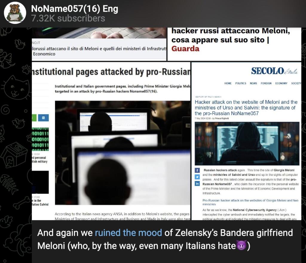 Stando alle rivendicazioni pubblicate all’interno del loro “particolare” canale Telegram, NoName057 ha colpito i siti istituzionali del MISE (Ministero delle imprese e del Made in Italy, guidato da Adolfo Urso) e del MIT (Ministero delle Infrastrutture e dei Trasporti, guidato da Matteo Salvini). Inoltre, gli attacchi DDoS sono stati rivolti anche al portale “personale” (ed elettorale) del Presidente del Consiglio dei Ministri, Giorgia Meloni, e un sottodominio – quello dedicato ai “Concorsi” – della Guardia di Finanza.